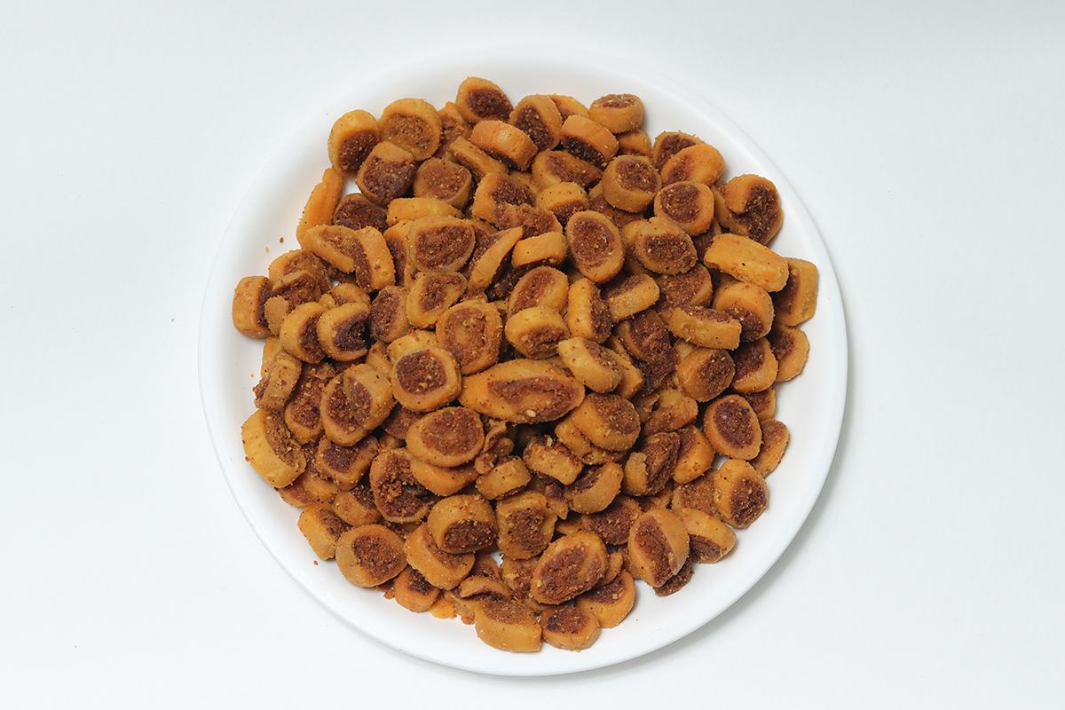 is a popular bite-sized version of the traditional Maharashtrian and Gujarati snack, featuring a crispy, spiral-shaped outer layer made of gram flour and a tangy-sweet filling of coconut, sesame seeds, and spices