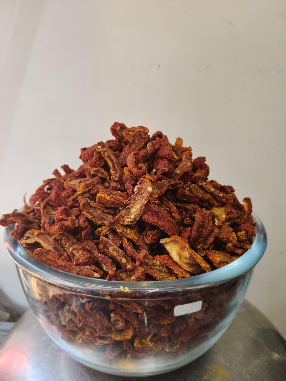 (Tomato Kachri) is a popular Gujarati snack or accompaniment made from dried tomatoes. It is essentially a type of sun-dried vegetable "chip" or fryum that is deep-fried before serving.